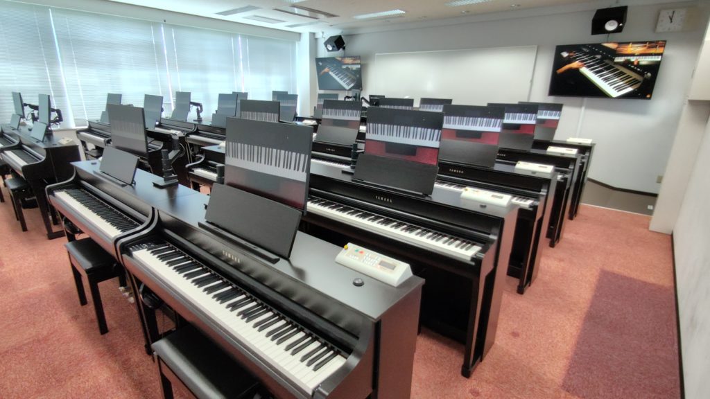 個別レッスン室ではできない集合学修(集合学習)と、電子ピアノの利点である静粛性(ヘッドホンを利用)、